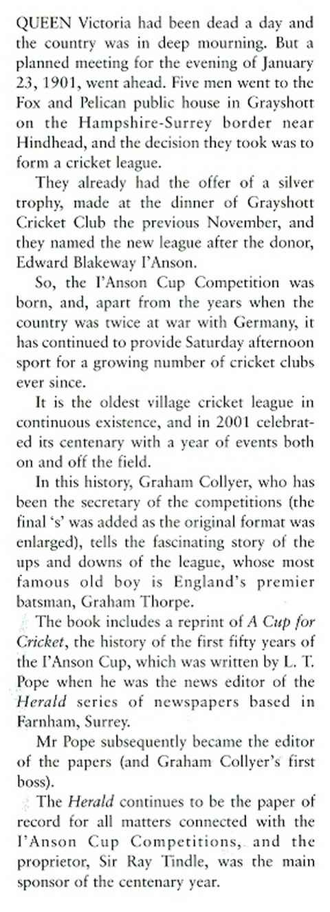 One of the oldest village cricket leagues in the country, it covers south-west Surrey, north-east Hampshire and north-west Sussex. See the description (below) from the dustwrapper flap.