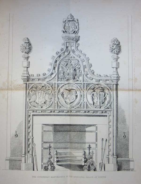 With a biographical notice of the Right Reverend Peter Courtenay, to which is added a description of the Courtenay Mantelpiece compiled by Maria Halliday, Limited edition of 200 copies, folding frontispiece engraving measuring 42 x 58 cm of the Courtenay Mantelpiece (see picture below) with loose tissue guard, further b&w illustrations from woodcuts, [vi] & 34 pp, white boards covered with ‘onion-skin’ paper which has split and has been pasted down (see pictures), edges uncut, 3 cm chip at base of spine, some pages a little spotted and browned but binding firm and altogether a good copy, Printed for Private Circulation Only, Torquay 1884