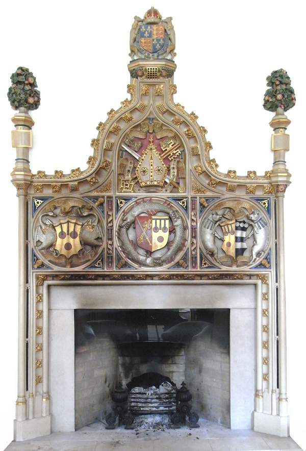The fireplace was installed between 1485 and 1486 in the Bishop’s parlour in the west wing of the Bishop’s Palace. It was described as “exceedingly ostentatious” by Pevsner, but ranks as the finest of a series of spectacular late medieval stone fireplaces that were created for various ecclesiastical residences in Exeter. See picture below.