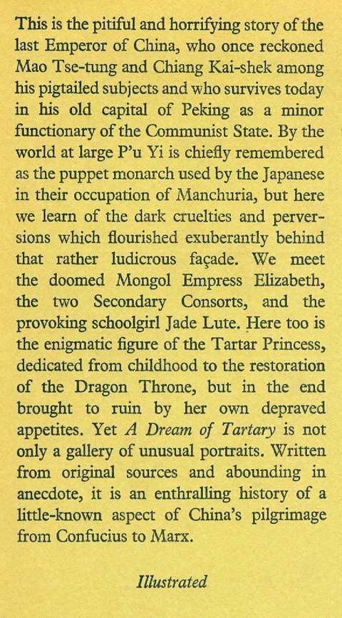 The Origins and Misfortunes of Henry P’u Yi, portrait frontispiece and illustrations from b&w photographs, map on endpapers, genealogical table of Manchu dynasty, index, 292 pp, decorated yellow boards with black spine, in d/w, extremities of d/w a little rubbed and torn, closed edges of pages a trifle spotted, otherwise in very good condition, George Allen & Unwin 1963