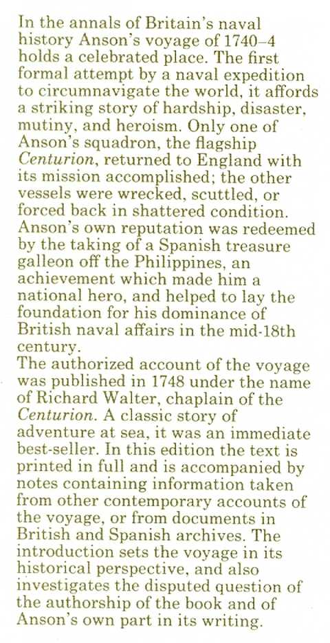 See the description (below) from the dustwrapper flap. The authorship of the book has always been in question, but the editor concludes that Walter, the Chaplain of Anson’s flagship ‘Centurion’, started to compile the book from his own journals with Anson’s collaboration. However, Walter proved unequal to the task, and the book was edited and completed by the more experienced Robins, though he had not been on the voyage.