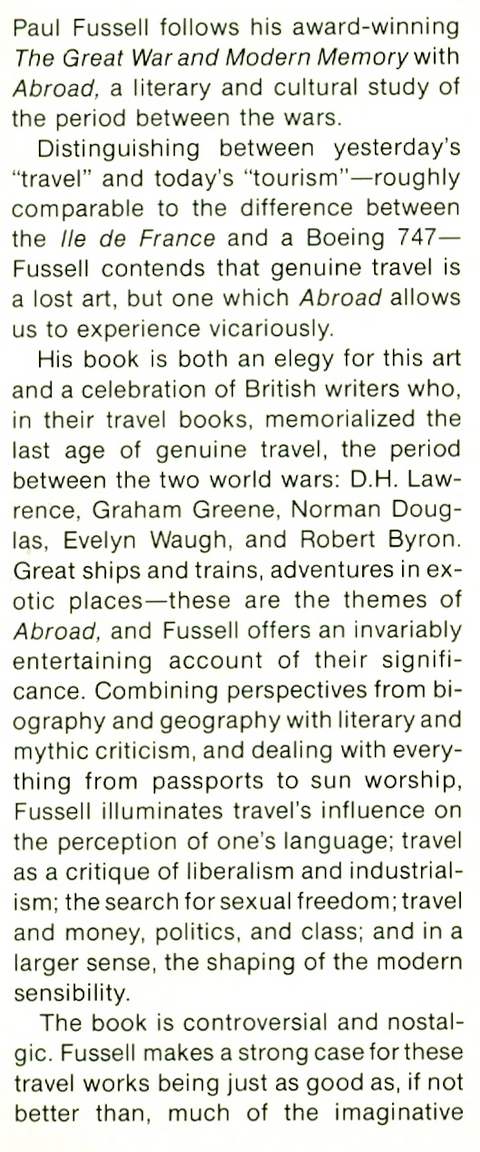 British Literary Traveling Between the Wars, b&w photographic illustrations, maps, bibliography, index, x & 246 pp, black cloth in d/w, slight mark to base of rear hinge of covers (glue from the binding process?), top and bottom edges of d/w slightly creased with small tears, slight spotting to closed edges of pages, occasional pencil markings and neat annotations in margins throughout, Oxford University Press (New York) 1980