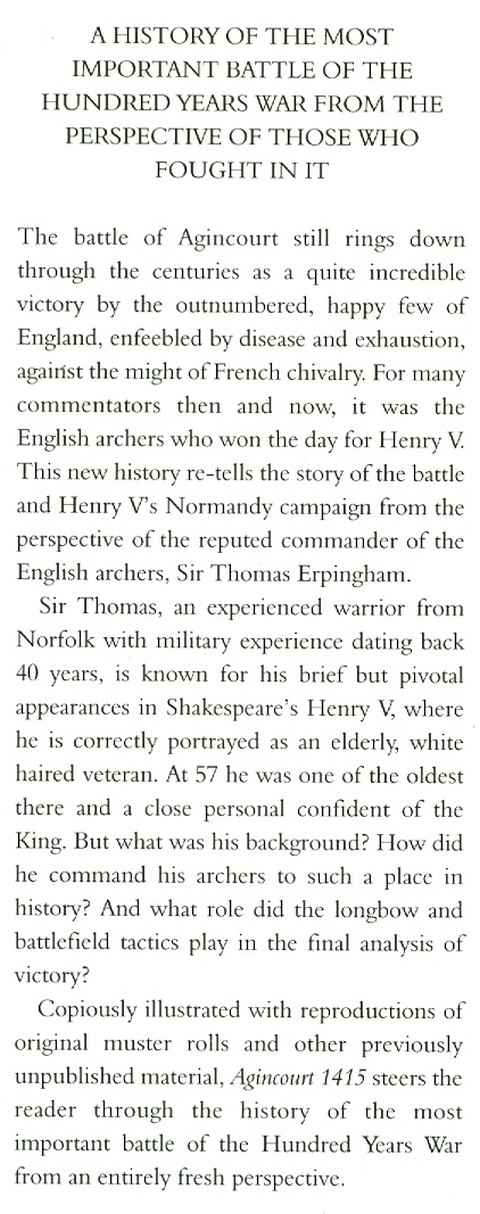 Henry V, Sir Thomas Erpingham and the Triumph of the English Archers, illustrations in colour and b&w from paintings, portraits, contemporary engravings and modern photographs, maps, battle-plan, bibliography & index, 160 pp, black boards in d/w, in fine condition, Tempus Publishing (Stroud, Gloucestershire) 2000