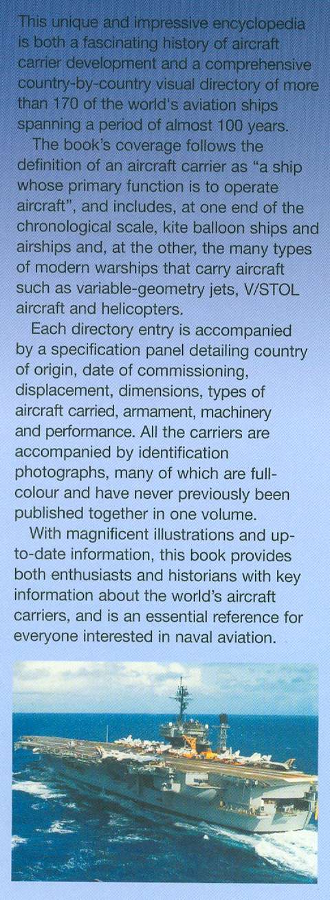 An Illustrated History of Aircraft Carriers of the World, from Zeppelin and Seaplane Carriers to V/STOL and Nuclear-Powered Carriers, Featuring Over 170 Aircraft Carriers with 500 Identification Photographs, modern photographs in colour, historic in b&w, coloured plan drawings, glossary and index, 256 pp, pictorial glazed boards with d/w, tear to top corner of d/w neatly repaired, otherwise in very good condition, Hermes House 2010