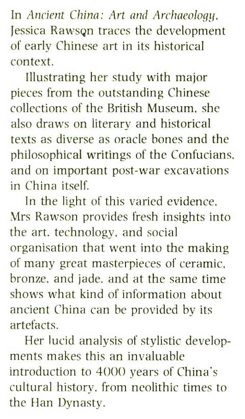 Art and Archaeology, very numerous illustrations (several in colour) from photographs, artefacts, line-drawings, elevation drawings, ground plans and maps of archaeological sites, bibliography, general index and indexes of Chinese characters and objects, 240 pp, green boards in d/w, top of spine a little bumped, top edge of d/w very slightly creased with small tear, endpapers, closed edges of pages and margins of pages a little browned, otherwise in very good condition, Book Club Associates by arrangement with British Museum Publications 1980