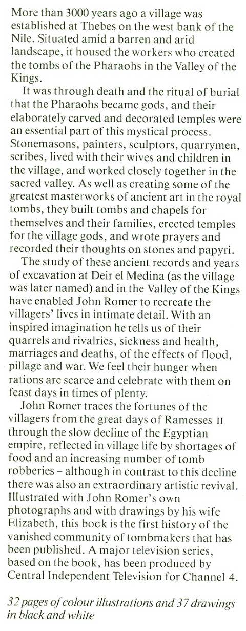 The Story of the Pharaohs’ Tombmakers, numerous colour photographic illustrations and line-drawings in text, chronological tables, maps, bibliographies, index, xii & 235 pp, blue boards in d/w, top and bottom edges of d/w very slightly creased, tiny tears to top of spine of d/w, otherwise in very good condition, Book Club Associates by arrangement with Weidenfeld and Nicolson 1984