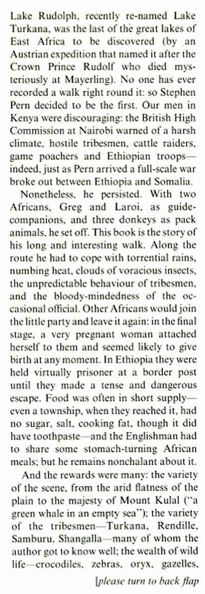 Walking Round Lake Rudolph, illustrations from b&w photographs, maps, glossary, 256 pp, brown boards in d/w, corners and top & base of spine slightly bumped, otherwise very good, Gollancz 1979