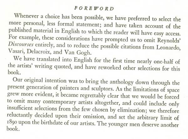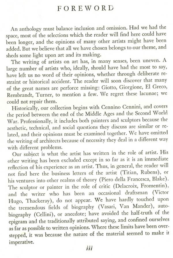 From the XIV to the XX Century, Second (revised) edition, very numerous b&w illustrations from portraits of the artists and selections from their works, list of sources, acknowledgement of extracts reprinted, index, xii & 500 pp, grey cloth (missing d/w), cloth at top of spine a little creased (but not torn), base of spine and corners a little rubbed, endpapers browned, presentation inscription on front endpaper, but binding sound and altogether a good copy, Routledge and Kegan Paul 1947