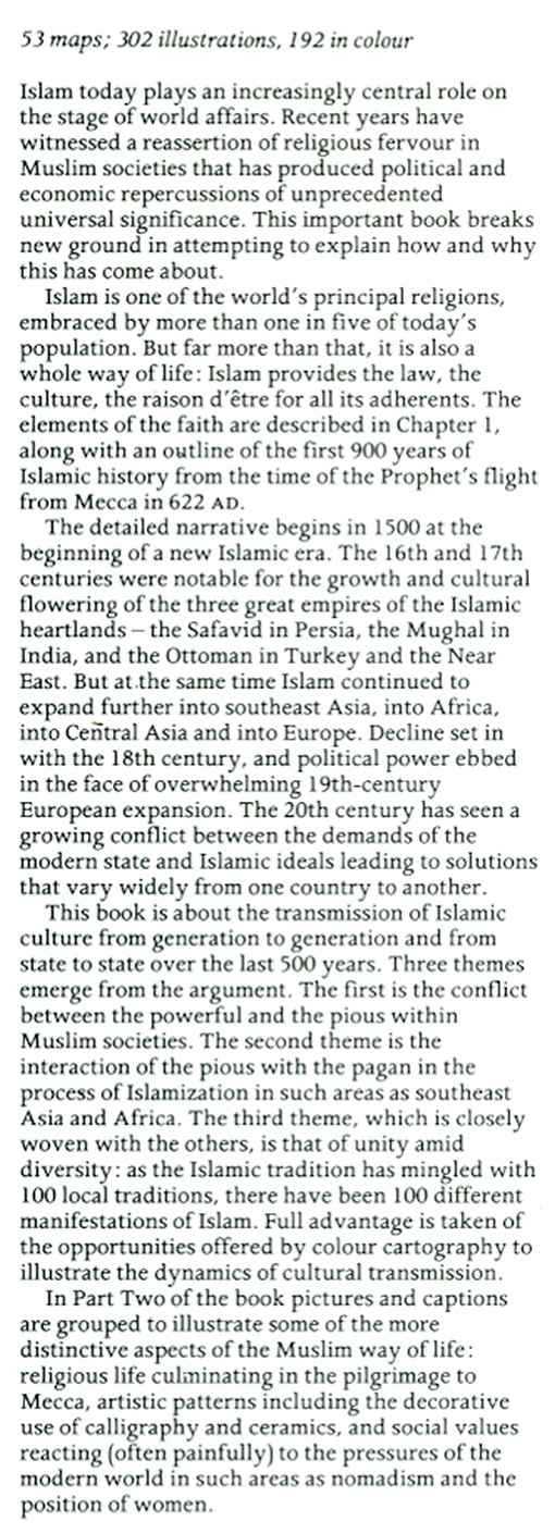 Very numerous illustrations in colour and b&w from photographs and paintings, line-drawings and diagrams, 53 maps, mostly coloured, chronological table, list of rulers of the Islamic World, glossary, bibliography, gazetteer and index, 238 pp, black boards in d/w, in very good condition, Time-Life Books (Amsterdam, Netherlands) 1994