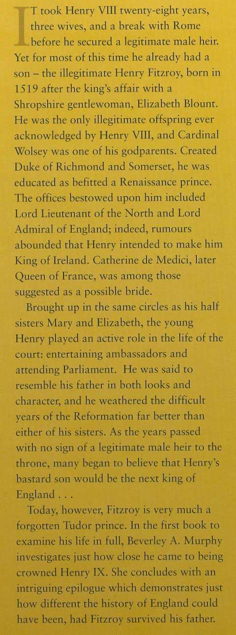 Henry VIII’s Lost Son, b&w illustrations from paintings, engravings, reproductions of contemporary documents and photographs, genealogical tables, notes, bibliography, index, vi & 282 pp, black boards in d/w, in fine condition, Sutton Publishing (Stroud, Gloucestershire) 2002