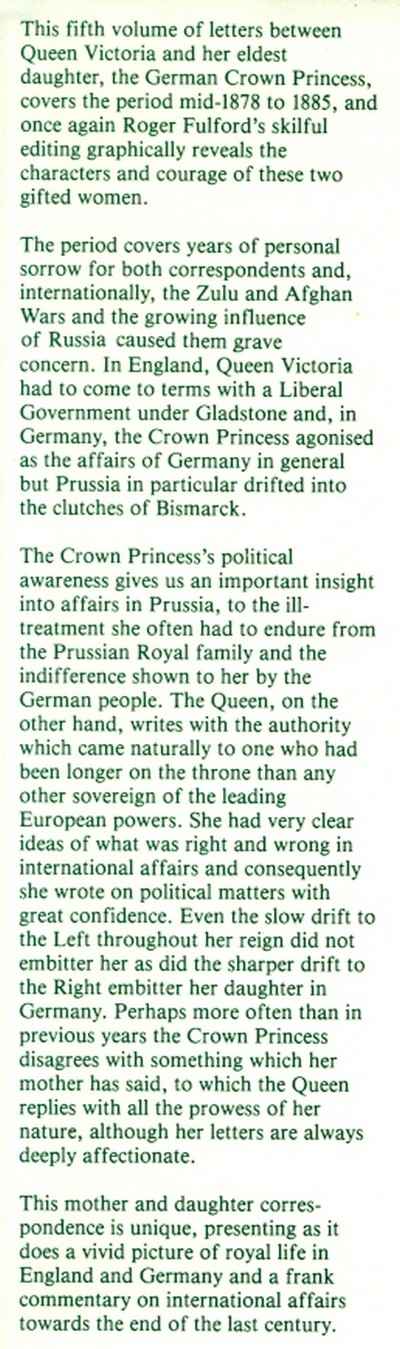 Private Correspondence of Queen Victoria and the German Crown Princess 1878-1885, frontispiece and illustrations from b&w photographs, two double-page family trees, key to names used in the correspondence, index, xiv & 209 pp, green boards in d/w, two tiny tears to bottom edge of d/w, otherwise in very good condition, Evans Brothers 1981