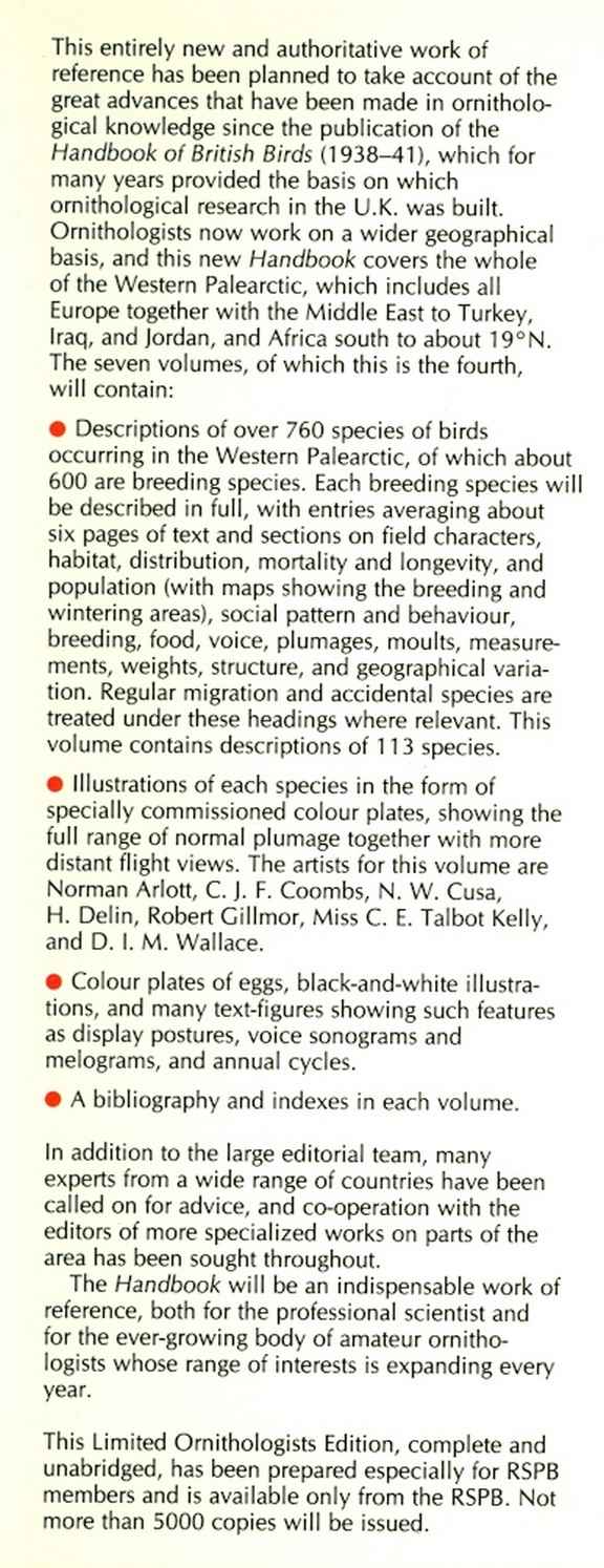 Out of print – now only available on CD-ROM (with the other eight volumes, as “The Complete Birds of the Western Palearctic”), at £142.95.