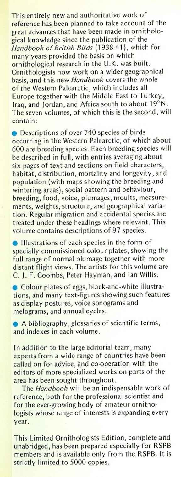 Each volume of this work is complete in itself - see the description (below) from the dustwrapper flap. Also covers grouse and other game birds, rails and cranes.