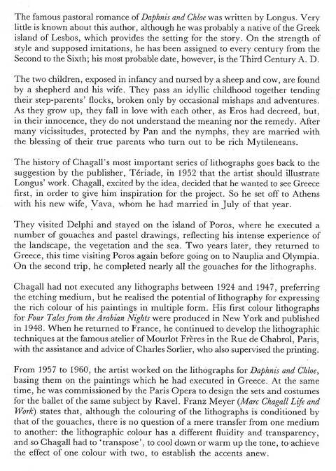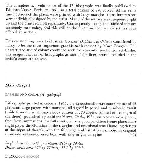 Chagall issued only 60 sets of these colour lithographs, together with 270 copies of the illustrations in book form. Therefore an auction catalogue is effectively the only way for you and me to see a complete set of the lithographs. This catalogue is a proper sewn hardback book.