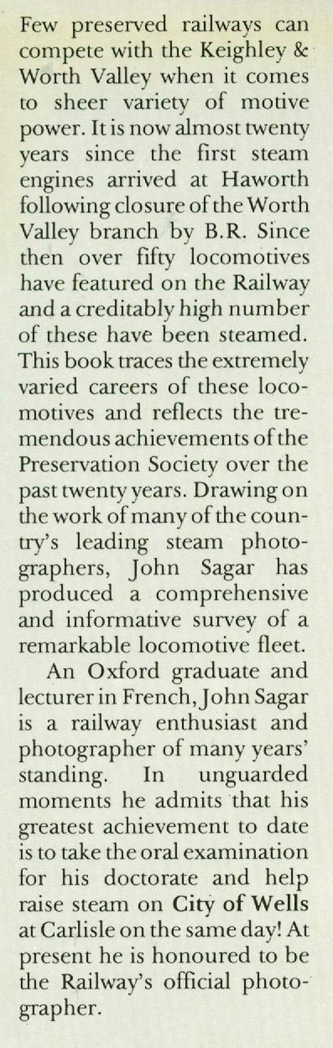 Steam Locomotives of the Worth Valley Railway, album of b&w photographs with descriptive captions and accompanying text, line drawings, map of the Worth Valley Railway, 160 pp, grey boards in d/w, top and bottom edges of d/w a little creased and rubbed with small tears neatly repaired, otherwise in very good condition, Bracken Books 1984