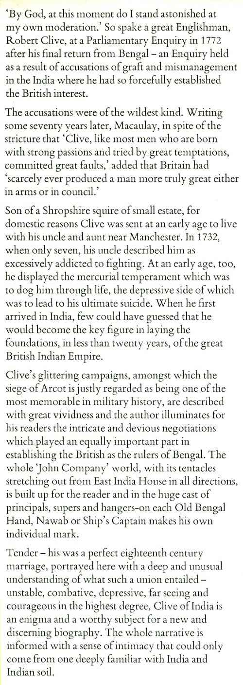 Colour frontispiece and b7W illustrations from portraits, paintings, contemporary prints and drawings, folding map of India, Bengal and the Carnatic (included loose and not mentioned in the list of illustrations), extensive notes, bibliography & index, xvi & 377 pp, red boards in d/w, base of spine and corners a little bumped, small tear to d/w at top of front cover, otherwise in very good condition, Book Club Associates in association with Constable 1974