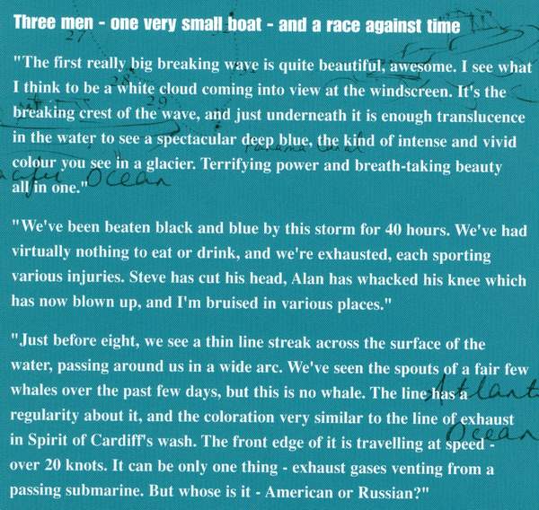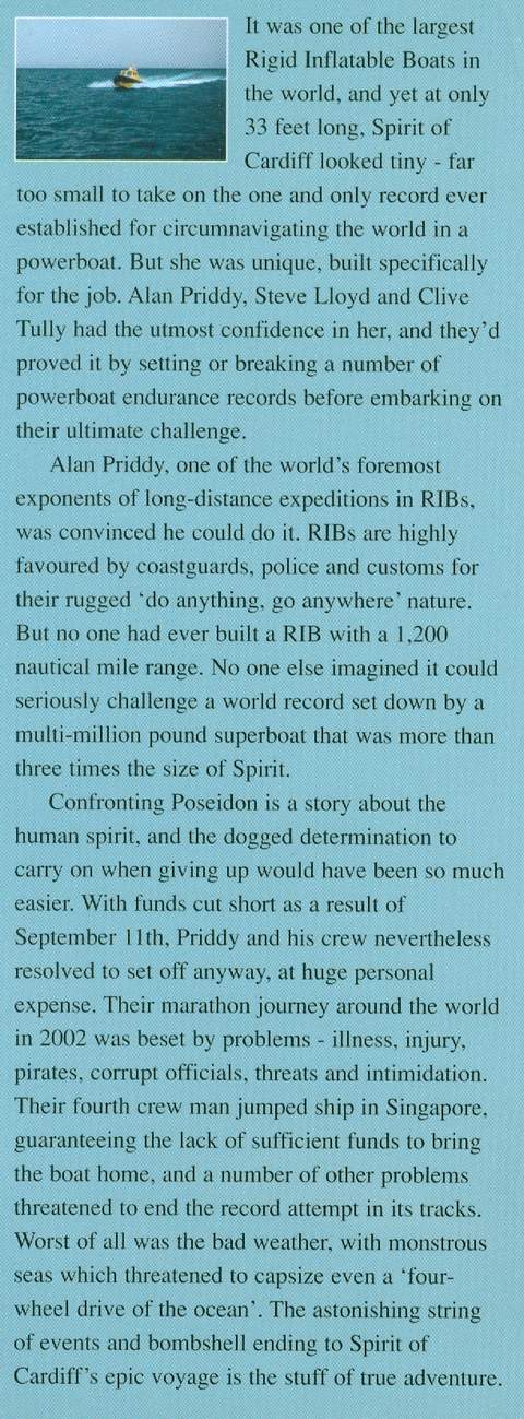 Around the World Against the Odds, Signed on the title page by the author and one of the crew members, numerous colour photographic illustrations, route map, appendices giving ‘Spirit of Cardiff’’s world records and details of the legs of the journey, 287 pp, blue boards in d/w, slight crease to first few pages, edges of pages just starting to darken, otherwise in very good condition, Offshore Publishing (Portsmouth, Hampshire) 2002