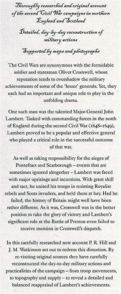 Major-General Lambert’s Campaigns in the North, 1648, b&w photo illustrations, 16 maps and diagrams, chronological table, glossary, appendix on sources, brief biographies of significant people mentioned, appendix reprinting Captain Birch’s ‘diary’, notes, bibliography and index, xxxviii & 216 pp, black boards in d/w, small stain (coffee?) to closed bottom edge of pages (not affecting pages themselves), otherwise in very good condition, Frontline Books (Barnsley, South Yorkshire) 2012