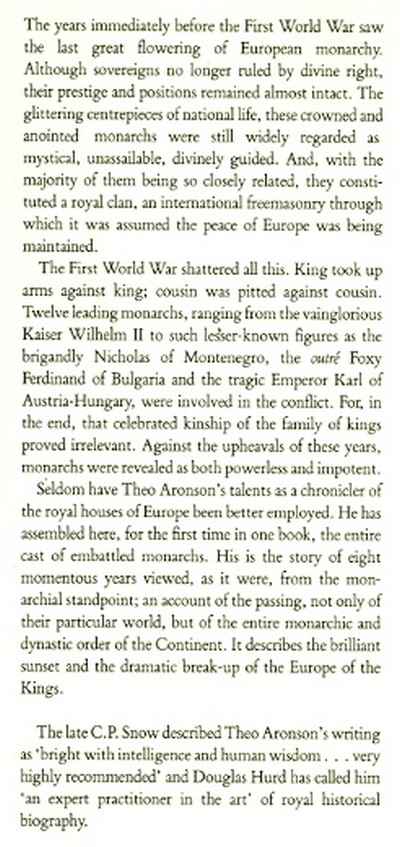 The Triumph and the Tragedy of European Monarchy 1910-1918, numerous illustrations from b&w photographs, maps, genealogical table, bibliography & index, xiv & 222 pp, blue boards in d/w, top & base of spine of d/w bumped, spine of d/w faded, otherwise in very good condition, Salem House Publishers (Manchester, New Hampshire) 1986