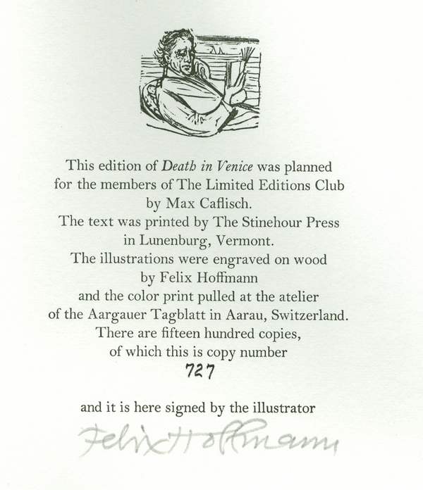 Translated by Kenneth Burke, Illustrated with wood-engravings by Felix Hoffmann, No. 727 of a limited edition of 1500, Signed by Felix Hoffmann, coloured woodcut frontispiece (see below) with numerous b&w woodcut illustrations in text, text printed on one side of the paper only, top edge and bottom edges cut, fore-edge uncut, 107 pp, colophon at end (see below), bound in quarter red morocco, spine gilt, with marbled paper boards, in slip-case, front corners of slip-case a little rubbed, rear of slip-case a little faded (see picture below), otherwise in near fine condition, Limited Editions Club (New York) 1972