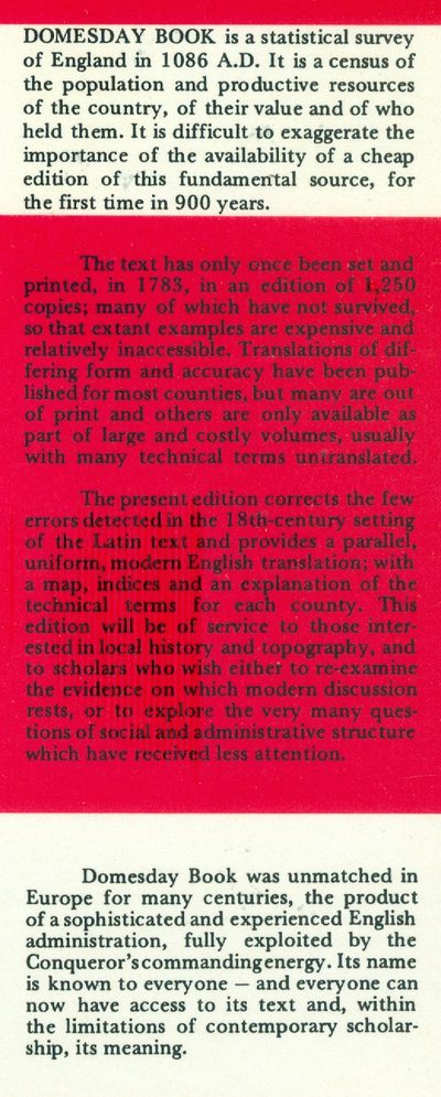 Edited from a draft translation prepared by Janet Mothersill, parallel Latin text with English translation (see pictures below), location maps, notes, glossary of technical terms, indexes of places and persons, 224 pp (though the pagination used is that of the Domesday Book itself), red boards in d/w, very slight spotting to closed edges of pages, otherwise in very good condition, Phillimore (Chichester, Sussex) 1976