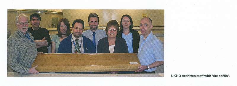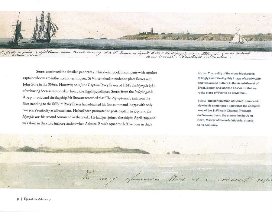 In the archives of the Hydrographic Office at Greenwich there is a box, termed by the staff ‘the coffin’ (see picture below).  This box contains 27 long watercolours of views from the sea, and mainly of the French coast, which the British navy was carefully watching, while also blockading the port of Brest, in view of the threat from Napoleon.  The book explains the paintings’ production and their extreme importance at the time, and reproduces many of the paintings for public view for the first time.  See also (left) the description from the dustwrapper flap.
