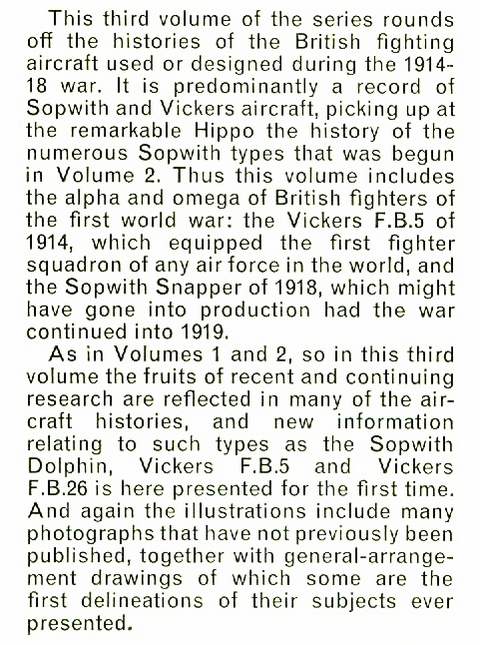 This volume describes, in considerable detail (see specimen page below), the less-well-known Sopwith fighters, the Pemberton-Billing (later Supermarine) aircraft and all the Vickers fighters. See the description below from the dustwrapper flap.