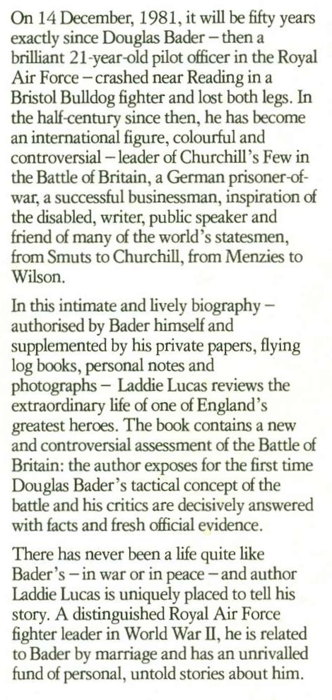The Epic Story of Douglas Bader, b&w photographic illustrations, appendices (including speeches given by Douglas Bader), index, 303 pp, dark green boards in d/w, top and bottom edges of d/w very slightly creased with tiny tear at top hinge of spine, pages and closed edges of pages a little darkened with slight spotting to closed edges and first few pages, otherwise in very good condition, Hutchinson & Co. 1981