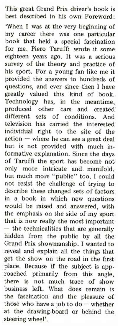 The Art and Technicalities of Grand Prix Driving, numerous photo illustrations (some in colour), line-drawn diagrams and circuit layout plans, 245 pp, red cloth in d/w, edges (and closed top edges) of pages a little spotted, otherwise in very good condition, William Kimber 1977