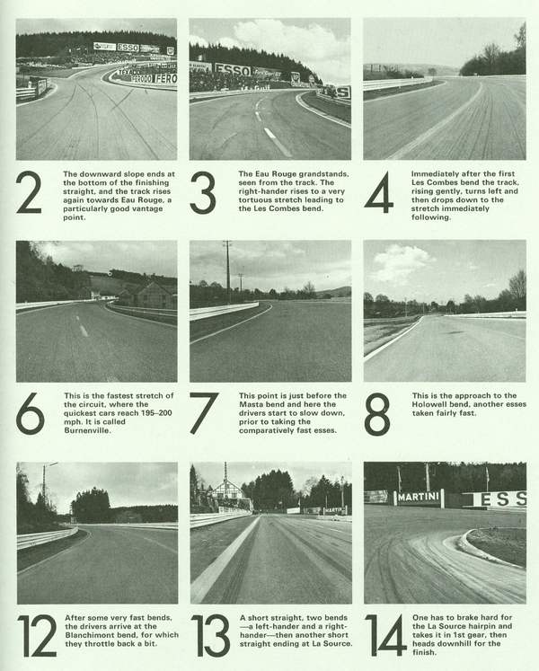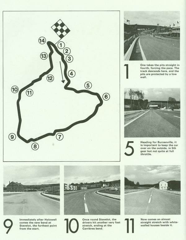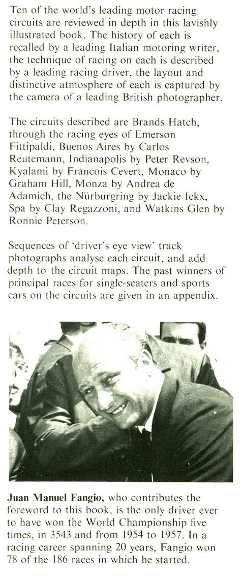 See the description below from the dustwrapper flap. The book is of great interest to enthusiasts of historic racing in that the circuits used nowadays (for example Spa, Le Mans and Monaco) are described in their 1974 form – see the specimen pages below.