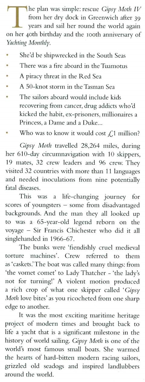 That is, the 53-foot ketch with which Sir Francis Chichester set the record for the fastest singlehanded round-the-world voyage in 1966-7. See the description below from the dustwrapper flap for details of the restoration and second circumnavigation in 2005-7.