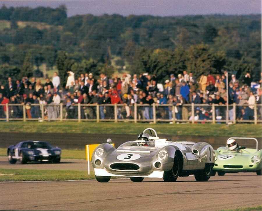 This was the famous Revival Meeting where Robert Brooks in his Lotus 19 (the pale green car in the second picture) was caught out by a sudden shower on the next-to-last lap.  He slid broadside into the chicane wall, which was fortunately no longer built of brick as it was in the 50s.  The result was an astonishing explosion of white polystyrene and red potted geraniums, but a largely undamaged car . . .