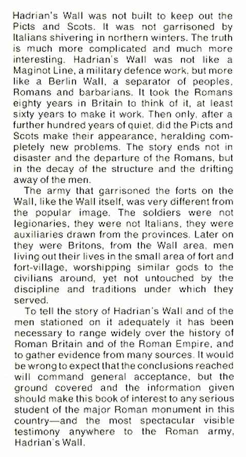 A scholarly study of all aspects of the Wall – e.g. the appendices are on Roman Emperors and Governors of Britain, the regiments on the Wall, the gods worshipped on the Wall, the Roman names of the forts, and the evidence still to be seen on the ground. See the description (below) from the dustwrapper flap.