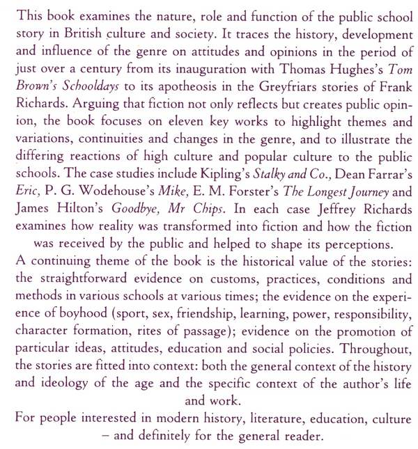 The Public Schools in English Fiction, chapter notes, bibliography, index, viii & 319 pp, dark brown boards in d/w, neat pencil markings in margins throughout, otherwise in very good condition, Manchester University Press 1988