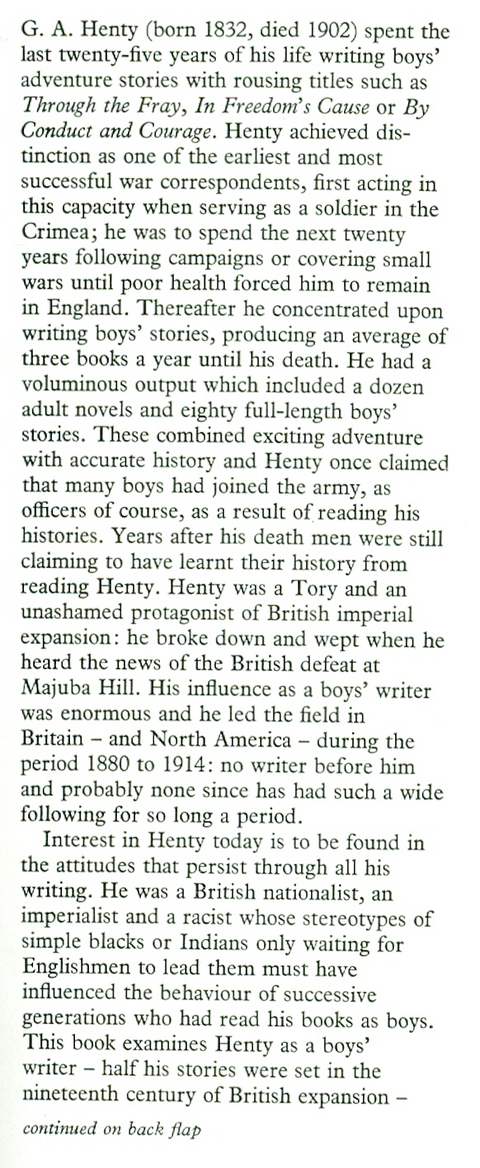 G.A. Henty: Imperialist Boys’ Writer, b&w frontispiece, appendix giving list and dates of the boys’ stories, bibliographical notes, index, [xvi] & 195 pp, blue boards in d/w, spine of d/w very faded, base of spine a trifle bumped, otherwise in very good condition, Hamish Hamilton 1980
