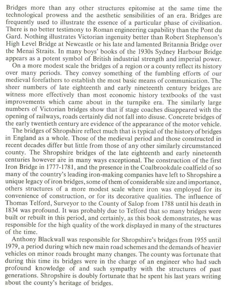 Illustrations from b&w photographs, maps and location maps, appendix on the restoration of the Iron Bridge at Coalbrookdale, pictorial glossary and list of bridges with Ordnance Survey map references, bibliography & index, x & 129 pp, red boards in d/w, in very good condition, Shropshire Libraries and Highways & Transport Department of Shropshire County Council (Shrewsbury, Shropshire) 1985