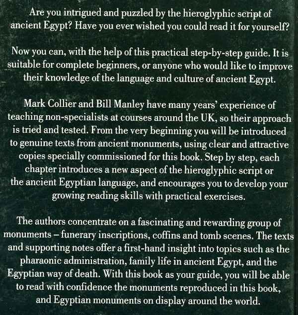 A Step-by-Step Guide to Teach Yourself, numerous illustrations from b&w photographs and line-drawings, short Egyptian-English vocabulary, bibliography and index, xii & 179 pp, glazed pictorial boards (no d/w, but I doubt if there ever was one), top corners slightly bumped, bottom corners possibly bitten by a very small dog, but binding and contents excellent, British Museum Press 1999