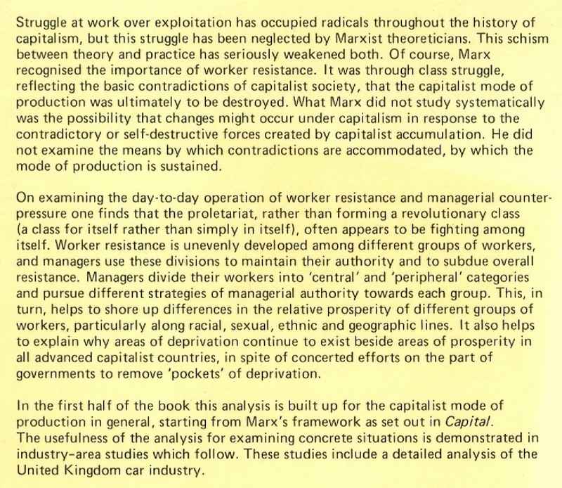 Class Struggle at Work and Monopoly Capitalism, maps, charts, tables and graphs, notes and references, bibliography & index, xiv & 312 pp, paperback, edges a trifle rubbed and creased, closed top edge of pages a little spotted, but otherwise in very good condition with uncreased spine, Macmillan 1977