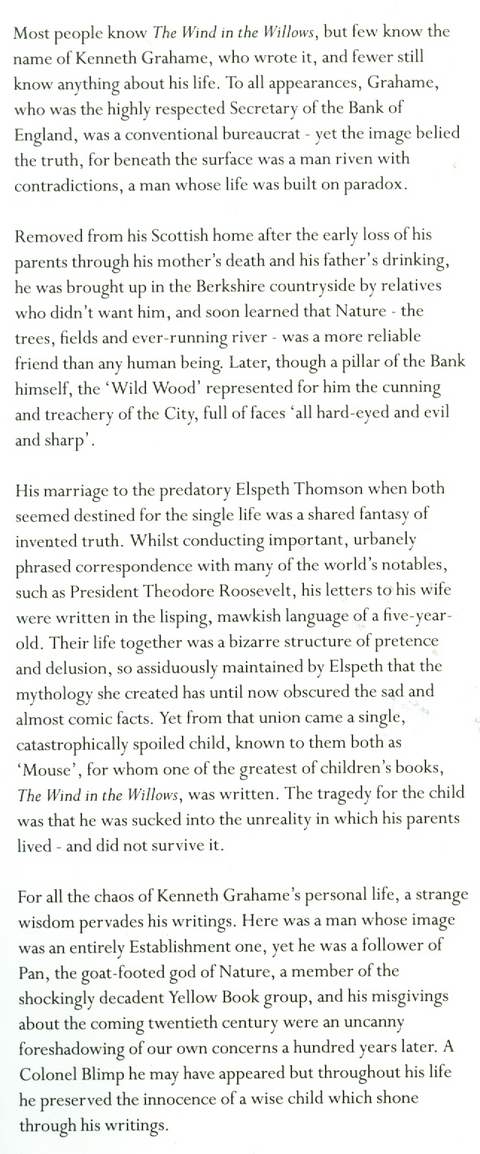 An Innocent in the Wild Wood, b&w illustrations from photographs, paintings and drawings, bibliography of Grahame’s works, bibliography, index, x & 384 pp, black boards in d/w, bottom edge of cover very slightly bumped, spine of d/w a little sunned, closed edges of pages a little marked, some neat pencil markings in margins throughout, otherwise in very good condition, Allison & Busby 1994