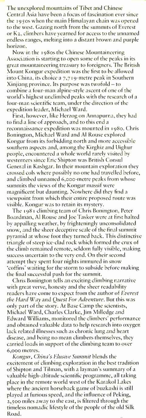 An unclimbed 7,719-metre peak between the Pamirs and the Kun-lun.  The Mount Everest Foundation managed to obtain Chinese approval by stressing the scientific and medical aspects of the expedition.