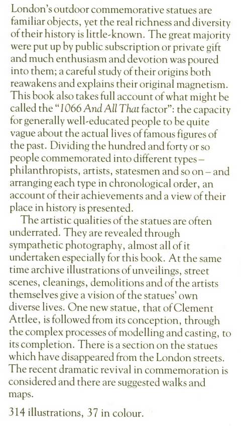 The Complete Outdoor Commemorative Statues, Photographs by Caroline Irwin, Richard Cheatle and Philip Ward-Jackson, very numerous illustrations in colour and b&w from photographs, engravings, line-drawings and cartoons, location maps, bibliography, index, 380 pp, blue boards in d/w, in very good condition (but see note below), Savoy Press 1989