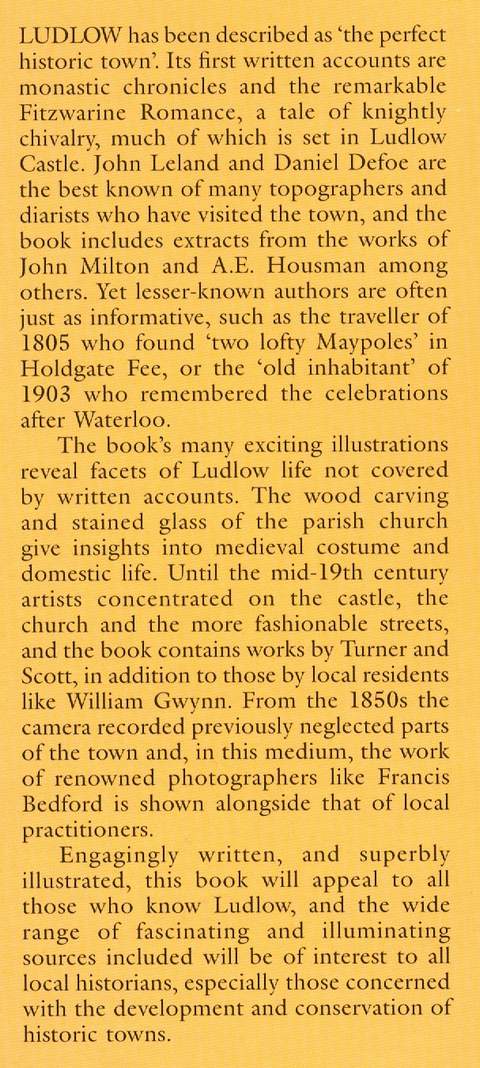 An Historical Anthology, 2nd edition, very numerous b&w illustrations from paintings, engravings, drawings and photographs, map of 17th-century Ludlow on endpapers, notes under text, index, xviii & 126 pp, maroon boards in d/w, top edge of d/w a little bent with small tears neatly repaired, otherwise in very good condition, Phillimore (Chichester, West Sussex) 2006
