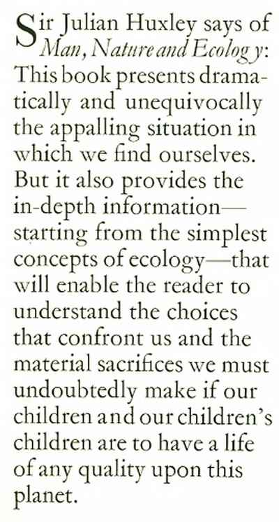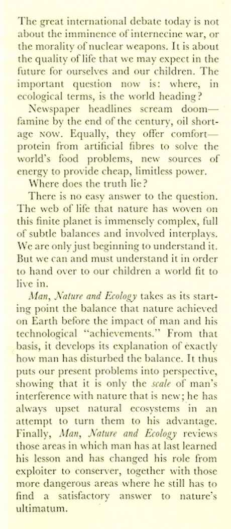 Very numerous illustrations from colour and b&w photographs, maps, diagrams and graphs, glossary of ecological terms, index, 448 pp, grey boards in d/w, spine of d/w faded, otherwise in very good condition, Aldus Books and Jupiter Books 1974