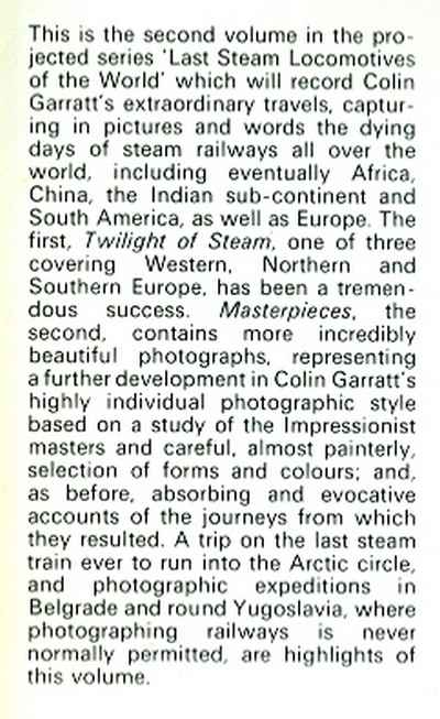 (Last Steam Locomotives of the World series), colour photograph illustrations with introduction and explanatory commentary on the plates, route-maps, index, 204 pp, black boards in d/w, very good condition, Blandford Press 1973