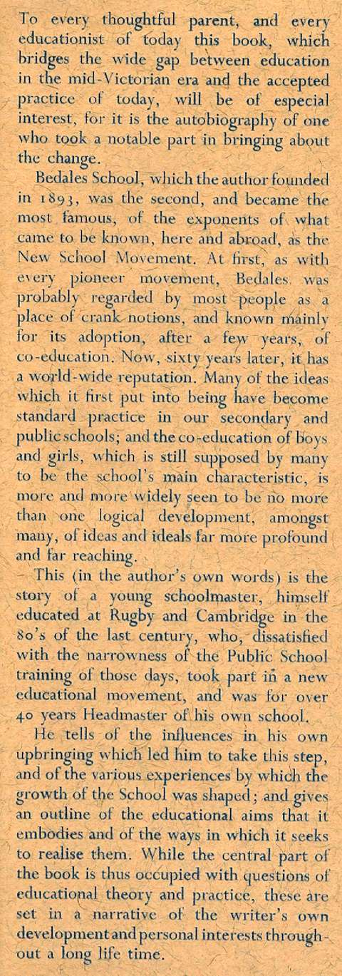 of the Founder of Bedales School and Its Headmaster, 1893-1935, portrait frontispiece, 342 pp, blue boards in d/w, top corners of boards slightly marked (see picture below), bottom edge of spine faded, spine of d/w faded, otherwise in very good condition, George Allen & Unwin 1955