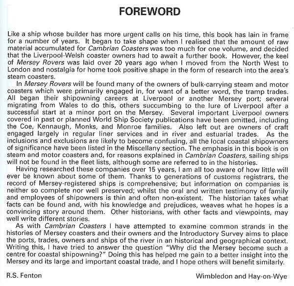 The Coastal Tramp Ship Owners of Liverpool and the Mersey, frontispiece and numerous b&w photo illustrations, 6pp colour plates at rear giving flags and funnel markings for the shipowners, plan drawings of two ships on endpapers (see pictures below), each shipowner is given its own entry and fleet list (see specimen pages below), bibliography and indexes of ships and shipowners, 344 pp, blue boards in d/w, in very good condition, World Ship Society (Gravesend, Kent) 1997