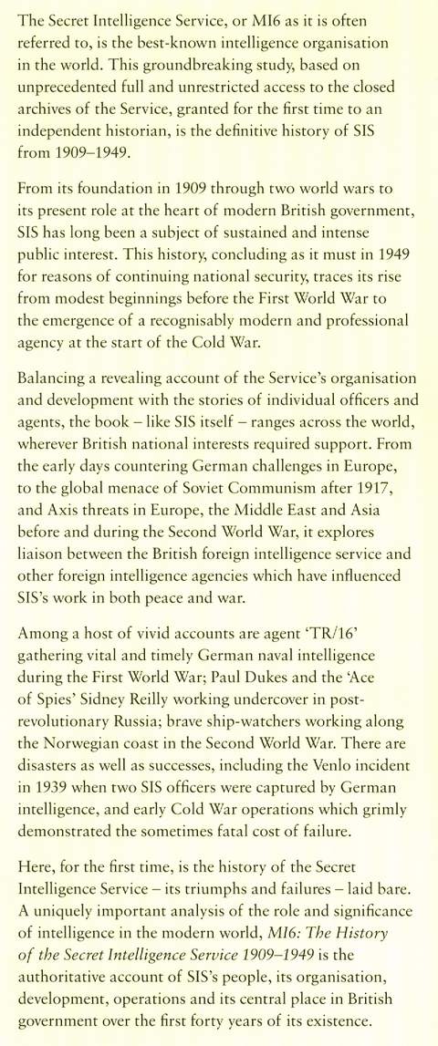 The History of the Secret Intelligence Service, 1909-1949, numerous b&w illustrations from photographs and reproductions of contemporary documents, chapter notes, bibliography, index, xxii & 810 pp, navy blue boards in d/w, base of spine very slightly bumped, top and bottom edges of d/w very slightly rubbed, small crease to edge of front cover of d/w, otherwise in very good condition, Bloomsbury 2010