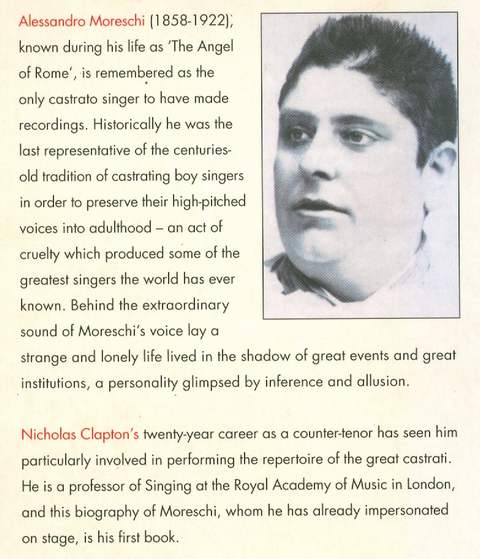 The Last Castrato, numerous illustrations in colour and b&w from photographs, portraits, paintings, engravings and reproductions of advertisements, notes, chronological table, bibliography, index, x & 181 pp, sewn paperback, rear cover a little creased, glaze starting to separate at bottom corner of front cover, slight spotting to endpapers, edges of pages just starting to yellow, very occasional notes in margin, otherwise in good condition, Haus Publishing 2004