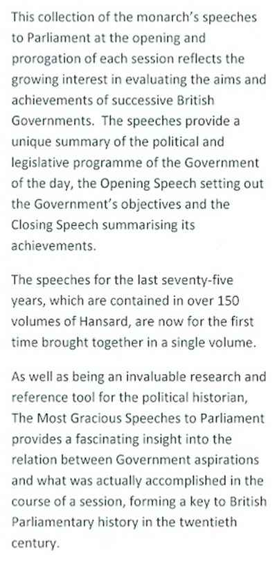 That is, what we now know as The Queen’s Speech, at the opening and closing of each session of Parliament. See the description (below) from the dustwrapper flap.