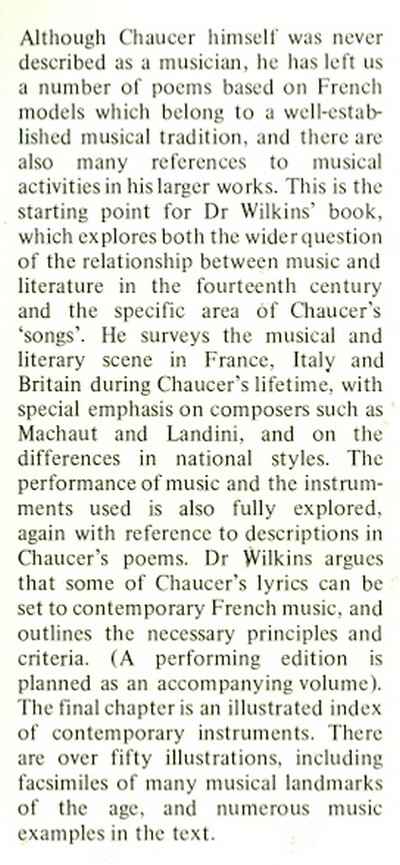 Explores the relationship between music and literature in the 14th century, with specific reference to Chaucer’s shorter poems, many of which were based on French models which belonged to a well-established musical tradition. See the description (below) from the dustwrapper flap.